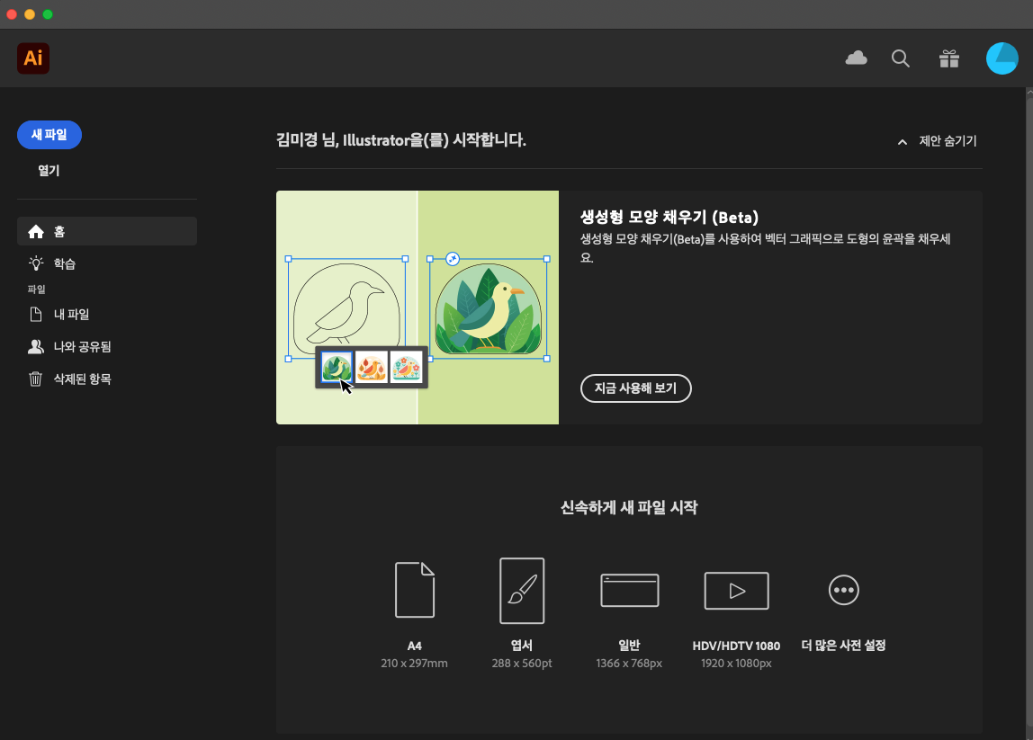 Illustrator 기능을 이용하고 싶다면 어도비 사이트에서 creative cloud앱 설치 후, 일러스트레이터를 설치해야 한다.