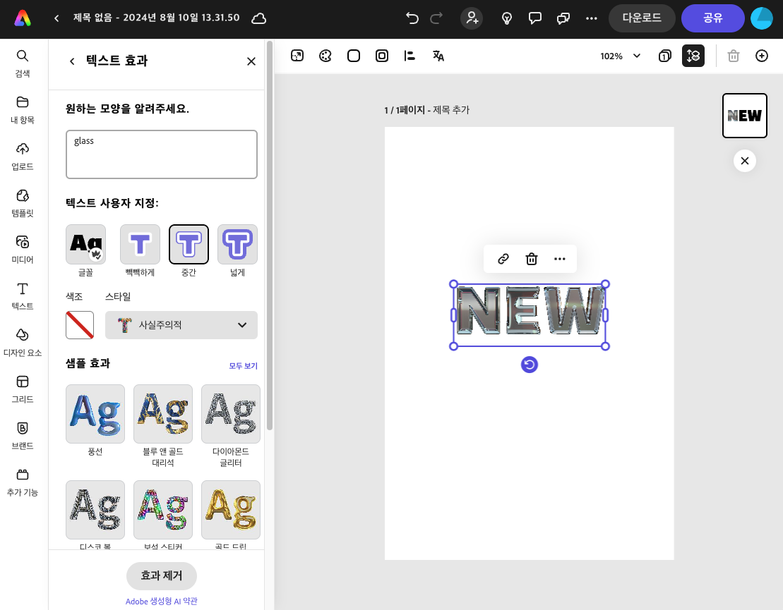 - 입력한 텍스트를 선택한 후, 왼쪽 패널의 아래에서 텍스트 효과를 클릭한다.