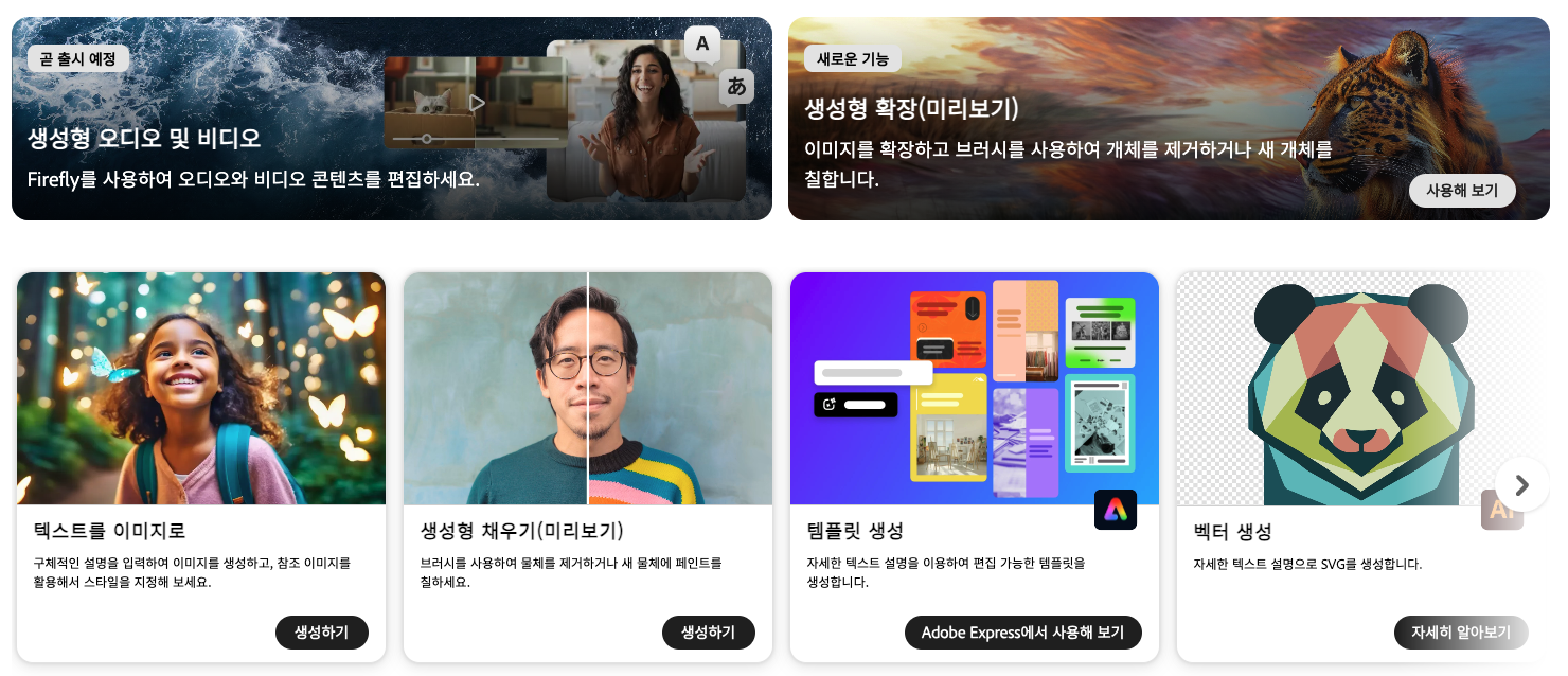 Firefly 사이트를 열고, Adobe 아이디로 로그인 또는 회원가입을 하면 Firefly Web / Express 기능을 사용할 수 있다.