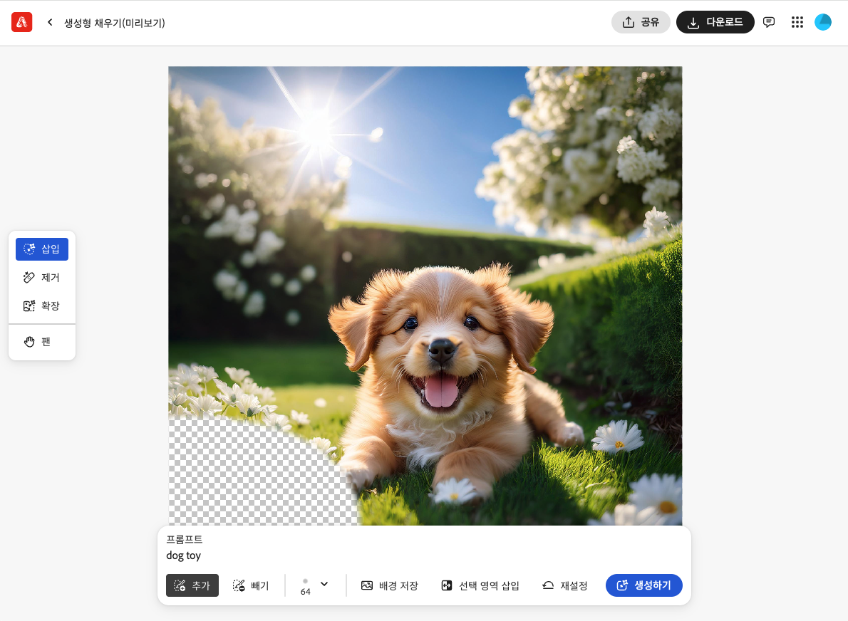 - 삽입할 요소를 프롬프트로 작성한 후, 생성하기를 클릭한다.