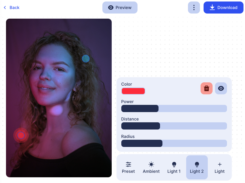 우측 패널을 통해 조명의 색/강도/거리/크기 등을 설정할 수 있으며, +버튼을 통해 조명을 추가할 수 있다.